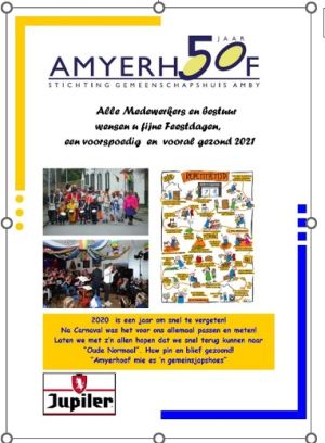 In augustus 2020 bleek dat het virus weer langzaam terugkeerde, wat in september weer resulteerde in verscherpte maatregelen en in oktober/november in een nieuwe lockdown. Het leven ging weer op slot, en voor de Amyerhoof had dit weer vergaande gevolgen. Met de feestdagen in het vooruitzicht plaatsten we de onderstaande advertentie in de kerstkrant van de Harmonie. Natuurlijk met de wens dat we ons allemaal gauw weer gezond konden treffen in de Amyerhoof.