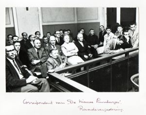 Vanuit de entreehal gaan we via de oude trap naar boven en bereiken we de bovenverdieping met aan de rechterkant de grote vergaderzaal. Vanaf de dertiger jaren tot 1970 hebben hier diverse onderwerpen de revue gepasseerd. Makkelijke discussies, verhitte debatten, urenlange gesprekken, maar altijd op een waardige fatsoenlijke manier. Honderden raadsvergaderingen hebben hier plaatsgevonden en menige ontwikkeling in ons dorp is hier in gang gezet. Ook toen al was de raadsvergadering doorgaans openbaar. Dat betekent dat publiek de vergadering mag en kan volgen door lijfelijk aanwezig te zijn. Ook de verslagen van de vergadering verschenen daags nadien in de krant. Jo Snackers heeft lang als Ambyse correspondent van De Nieuwe Limburger verslag geschreven voor de krant.
