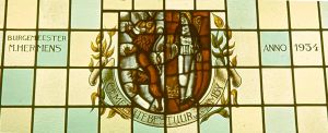 We verlaten de kamer en steken de entreehal over naar de oude burgemeesterskamer. Ze heeft een transformatie ondergaan. Behalve de mooie haardmantel is er weinig herkenbaar uit de werkperiode van voor 1970. Dus verlaten we dit lokaal en brengen een bezoek aan de oude werkkamer van de gemeentesecretaris, de heer Lamkin. Hier proeven we nog enige sfeer van toen.