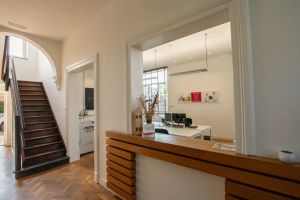 Via de huidige statige voordeur stappen we de hal binnen, waar Marjolein ons vriendelijk ontvangt. Snel blijkt dat de typische entourage die het gemeentehuis ooit kenmerkte heeft plaatsgemaakt voor een mooi, net, kantoorpand anno 2025. Hoewel, de mooie trap, is er nog steeds. Jo: “Hoe vaak zal ik hier naar boven en weer terug zijn gelopen?” Aan de rechterkant in de hal bevindt zich een loket met zicht op een mooie kantoorruimte. Ook vroeger was dit loket er al. Het had toen al ‘de publieksfunctie’, het burgerloket. Iedereen die het gemeentehuis binnenkwam, meldde zich in eerste instantie aan het loket.
